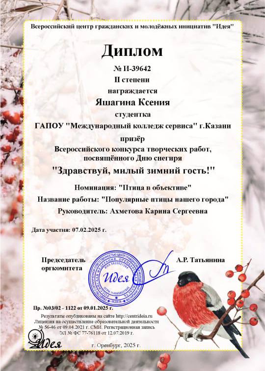 7 февраля прошел Всероссийский конкурс творческих работ, посвященный «Дню снегиря». В конкурсе приняла участие студентка нашего колледжа - Яшина Ксения, группы 134093 и стала призером, выиграв диплом lll степени.